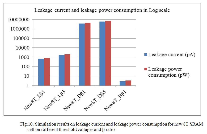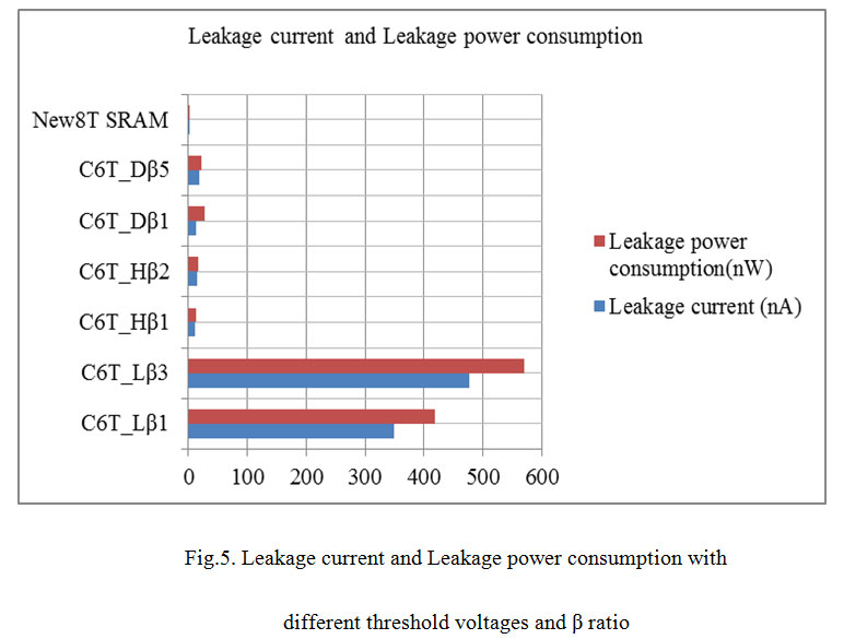In this section β is varied for the conventional 6T SRAM cell and then all performance parameters are evaluated. Table 1 and fig.5 show the simulation results of leakage current and leakage power consumption for new 8T SRAM cell and conventional 6T SRAM cell with different threshold voltage and β ratio.