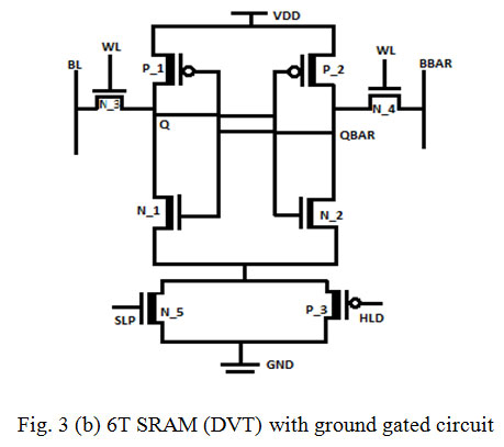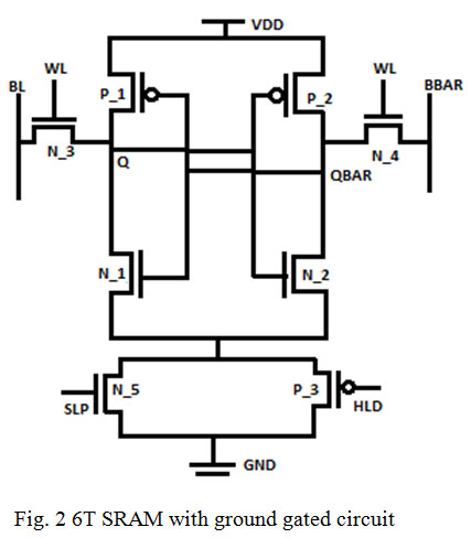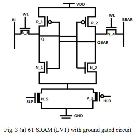 In ground gated 6T SRAM circuit a high threshold PMOS hold (HLD) transistor is connected in parallel with high threshold NMOS sleep (SLP) transistor shown in fig.2. This circuitry is connected between the memory cell and ground [12]. During the active mode sleep transistor (N_5) is kept ON while hold transistor (P_3) is OFF. That maintains the ground level approximately at 0 volts. During the idle mode sleep transistor is off whereas hold is on [13]. This particular state of the sleep and hold transistors suppress the leakage current when the circuit is in idle mode [11] [14]. In sleep mode the on state of the hold transistor helps to preserve the stored content of the cell [15].