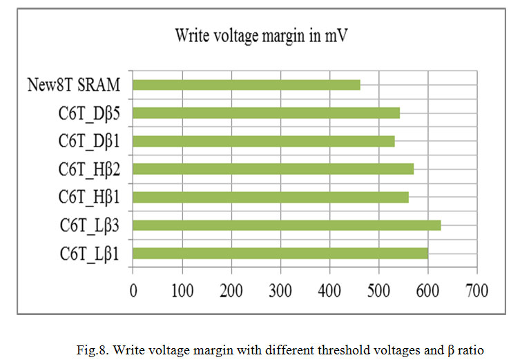 Write voltage margin is the measure of write ability. The maximum noise voltage necessary to flip the stored bit of the cell, defines the write voltage margin. In this paper the write ability is measured using write trip point. It shows how difficult it is to write to the storing nodes of the cell [7]. The bit-line voltage is swept from 0v to VDD, and the flipping voltage of the cell, when Q and QBAR flip their data is noticed. The value of bit-line voltage at the crossing point of internal storage nodes Q and QBAR represents the write trip point [16]. Table 4 and fig.8 represent the write voltage margin for new 8T SRAM cell and conventional 6T SRAM cell with different threshold voltage and β ratio.