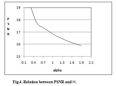 The value of α is tested in the interval is the size of watermark and ∝∈[0,0,3]. It is found that the value of PSNR is decreasing with the value of as shown in Fig(4).