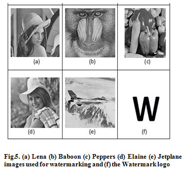 In this paper, an experiment is performed on host images like Lena, Baboon, Pepper, Elaine and Jet of size 512X512 and a watermark logo of size 32X32 is used. The value of is taken as 0.3 Performance of watermarking algorithm is done on the basis of two parameters imperceptibility and robustness. PSNR is used to measure the quality of watermarked image with the original host image. Higher the value of PSNR, better is the quality of watermarked images. PSNR between the original image and watermarked image H and H’ is [17].