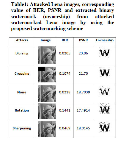 Table 1: Attacked Lena images, corresponding value of BER, PSNR and extracted binary watermark (ownership) from attacked watermarked Lena image by using the proposed watermarking scheme