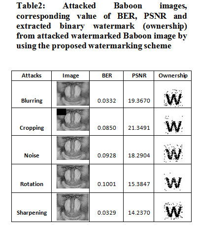 Table 2: Attacked Baboon images, corresponding value of BER, PSNR and extracted binary watermark (ownership) from attacked watermarked Baboon image by using the proposed watermarking scheme