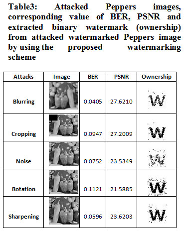 Table 3: Attacked Peppers images, corresponding value of BER, PSNR and extracted binary watermark (ownership) from attacked watermarked Peppers image by using the proposed watermarking scheme