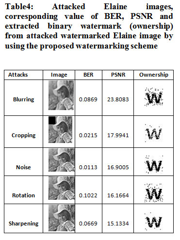 Table 4: Attacked Elaine images, corresponding value of BER, PSNR and extracted binary watermark (ownership) from attacked watermarked Elaine image by using the proposed watermarking scheme