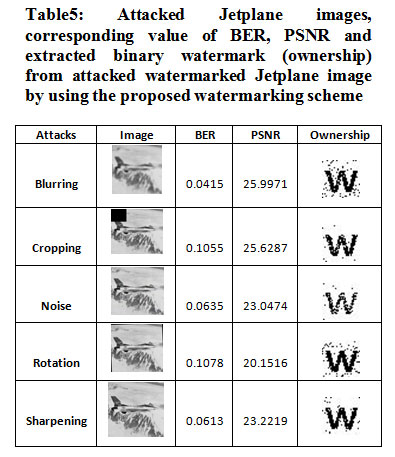 Table 5: Attacked Jetplane images, corresponding value of BER, PSNR and extracted binary watermark (ownership) from attacked watermarked Jetplane image by using the proposed watermarking scheme