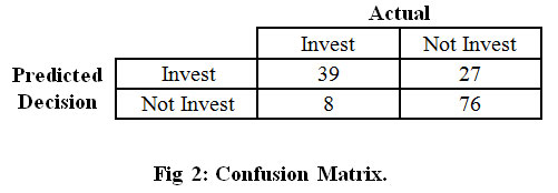 Total 150 companies are analyzed by the current system. Results are depicted as following matrix. Out of 150 companies 39 are in profit having decision Invest. 76 companies are in loss where the decision is not invest. Companies are in loss when the decision is invest are 27. Companies are in profit when the decision is not invest are 8.