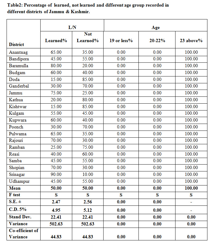Table 2: Percentage of learned, not learned and different age group recorded in different districts of Jammu & Kashmir.