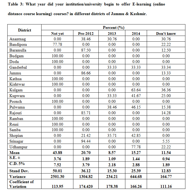 Table 3: What year did your institution/university begin to offer E-learning (online distance course learning) courses? in different districts of Jammu & Kashmir.