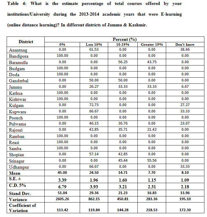 Table 4: What is the estimate percentage of total courses offered by your institutions/University during the 2013-2014 academic years that were E-learning (online distance learning)? In different districts of Jammu & Kashmir.