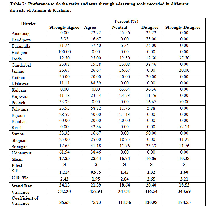 Table 7: Preference to do the tasks and tests through e-learning tools recorded in different districts of Jammu & Kashmir.