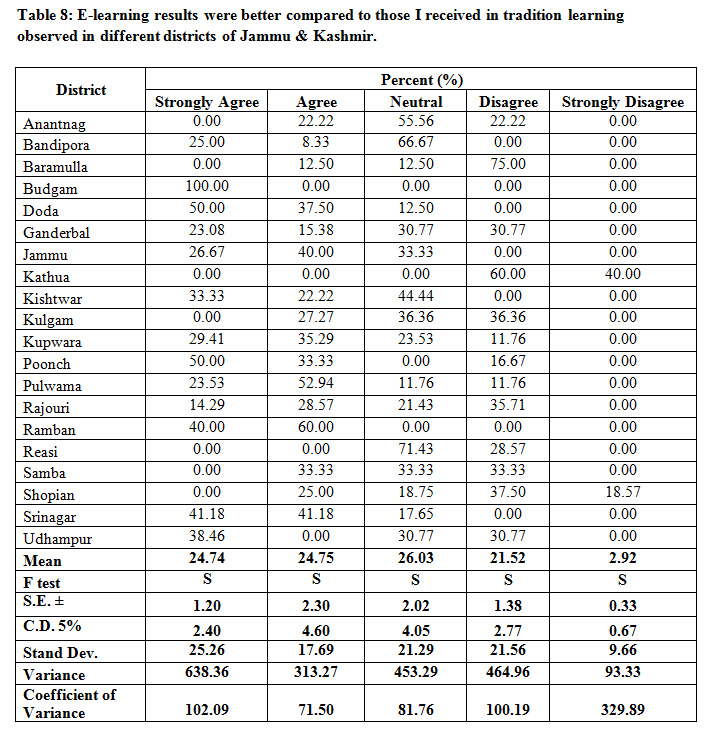 Table 8: E-learning results were better compared to those I received in tradition learning observed in different districts of Jammu & Kashmir.