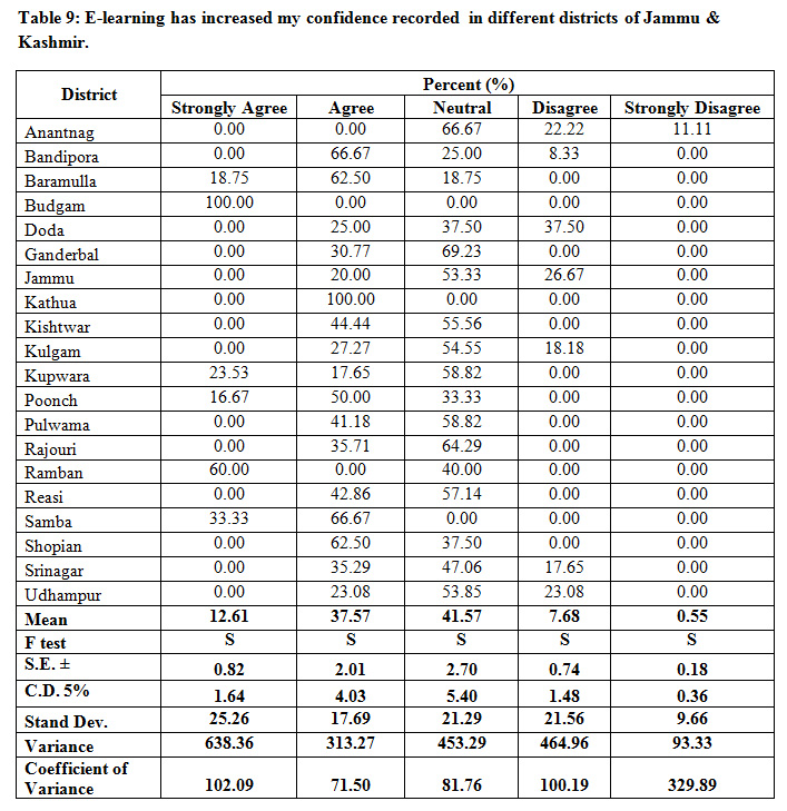 Table 9: E-learning has increased my confidence recorded in different districts of Jammu & Kashmir.