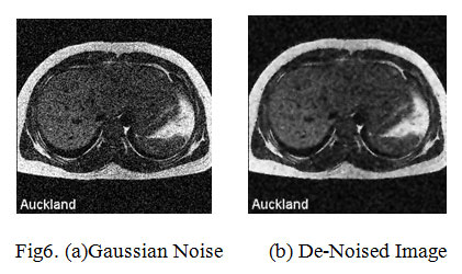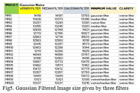 Third is the Gaussian Noise which is added to the images shown in the fig 6(a).Gaussian distribution which is also known as normal distribution whose probability is equal to statistical noise known as Gaussian Noise. Due to poor illumination and great extent of temperature or transmission of particles in an electronic image it fails to meet up the requirement for the clear image this noise is caused. By using a Weiner filter this noise can be reduced to very much extent. Same filters are used to check out the best filter for this noise. The best filter was Weiner filter but the minimum size value after using the different filters is given by all three filters shown in fig 5. Each filter is used on all the images, their outcome is noted and compared with the other entire filter applied on the same images. The circularly symmetric Gaussian behavior is found in the mellow ultra- sound speckle echo for marginal statistics which is similar to the laser speckle for monochromatic illumination [12].