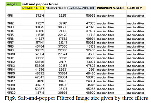 Fifth Noise is the Salt and Pepper Noise which is added to all the MRI images and the filtered applied on these images is Weiner Filter, Median Filter, and Gaussian Filter. Impulse noise is a kind of noise which is occurred due to the external channels and environment which affects the communication system, breakdown of image acquisition devices and sensor faults. Black and white dots which are usually seen in an image is due to this kind of digital images which are literally referred to as Salt-and-Pepper noise. The Median filter is used commonly to remove this kind of noise. In the experiment the used three filters were Weiner filter, Gaussian filter, Median filter [15] and the best result is observed by the median filter and the minimal size of an image was also noted by the same filter. A Super-Mean Filter (SUMF) has been used to remove high density Salt & Pepper noise from digital images. The working of this filter are generally in two stages, first stage is the detection of the noise in the image and the second stage is the pixel in an image is replaced by the mean value of the neighborhood noise free pixel[16].