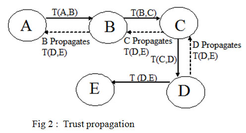 A node computes trust for a target node and transmits that trust value to its neighbouring nodes, so that neighbouring nodes save time and resources of recomputing the trust values for the same node [2]. Consider, fig 2, in the network there are five nodes A, B, C, D and E. A computes trust value denoted as T (A, B) for the target node B. B computes T (B, C) for the node C. C computes T(C, D) for node D and D computes T (D, E) for the node E. Node A needs the trust value of E, for that D propagates T (D.E) to C and then C propagates T (D, E) to B and then to the trust requesting node A.