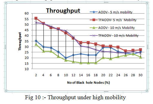Fig 4, fig 7 and fig 10 shows PDR, ETD and throughput under high mobility of 5m/s and 10 m/s of nodes. Clearly TMPCF outperformed AODV, but because of high mobility there may be some link breaks occur, so at mobility of 10 m/s performance of both protocols deteriorates.