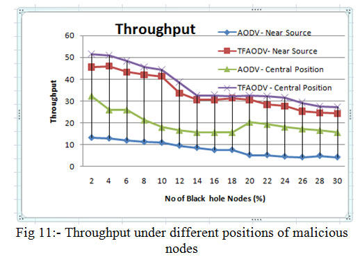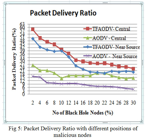 Fig 5, fig 8 and fig 11 shows PDR, ETD and throughput under different positions of malicious nodes, positions of normal nodes are random. The node’s positions are taken as central to the complete terrain area and near the source node. Performance under these scenarios shows, that when malicious nodes are near to the source node, performance deteriorates because malicious node is in contact with the source node and drop packet immediately it receives. But, in this case too TMPCF’s performance saw some enhancements over AODV under any position of nodes.