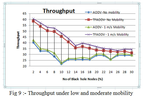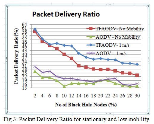 Fig 3, shows PDR for low mobility and stationary nodes. Clearly TMPCF have outperformed AODV in terms of PDR under this case. Furthermore, TMPCF’s PDR under low mobility of 1 m/s is also outperforming stationary node’s PDR may be because malicious node may not be in completely contact with victim nodes always, which is possible in stationary node case. Hence, network performance due to malicious nodes may be improved in low mobility case as compared to stationary case. Same behavior is also observed in case of throughput and ETD parameters as seen in fig 6 and 9.