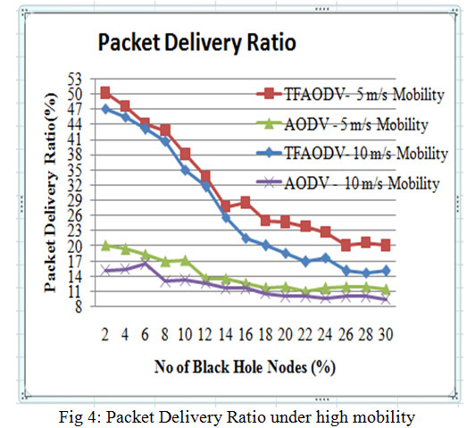 Three performance metrics are assumed for analysis of TFAODV protocol Packet delivery ratio (PDR), Average End-to-end Delay (ETD) and Throughput. These network metrics are evaluated for both the protocols AODV and TFAODV under varying network conditions. The simulation was carried out using NS2 as simulator with input parameters as given in table 2.