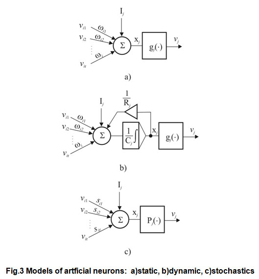 Fig.3 Models of artficial neurons:  a)static, b)dynamic, c)stochastics