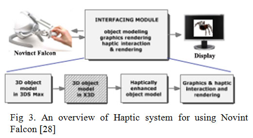 VRET shows a greater advantage using other techniques as it equips the therapist with the freedom to control the feared stimuli and the movements of the virtual spider. In case of exposure in vivo it becomes difficult to have a control on the real spider and move the spider according to the requirements. Moreover, a virtual spider can be made to increase in size and can be made to appear more frightening to evoke the stimuli for the patients. In order to make the virtual therapy more effective the virtual spider must resemble closely to a real spider. In general, terms the greater the similarity between the virtual environment and the real environment, the more will be the transfer of training to the real world.To increase the level of presence on the behalf of the participant’s side tactile augmentation can be introduced which involves the use of some position tracked real objects on the participant’s behalf that provides a way to interact with the virtual world objects to suspend disbelief from the participant’s perspective. Recent researches shows the use of a Novint Falcon device, a haptic interaction tool that can used within a dedicated virtual environment to elicit disgust, as changes in fear and in disgust were shown to be highly associated with the observed decline in arachnophobic symptoms [12]. A haptic interaction tool involves the transmission of signals between the participant and the computer via force, vibration and motion. This interaction also provides a feedback to the user as a force which points to a direction and possess certain magnitude. Using this haptic tool the participant or the user can interact with the virtual spider by means of his virtual hand within the virtual environment.