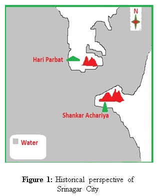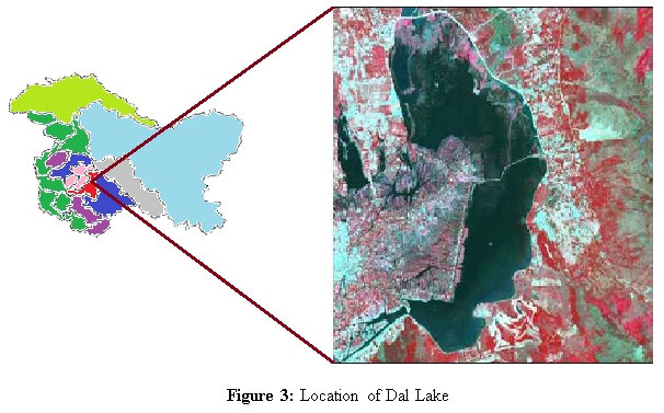 The valley of Kashmir in the early history records has been discovered as a wide basin between the mountains as illustrated in the Figure 1. With time the shallower regions have converted to land mass. From the maximum waters, now the land has turned into this state of maximum land mass. The location of the Dal Lake in the capital city of Srinagar is to the North-East of the main city but the overall status of Srinagar can be said to be on the peripheries of the lake as illustrated in the Figure 3. This aspect on one hand gives a unique charm to the city but the same feature creates a hazardous impact of the health of this glorious water body. Human population residing inside (Houseboats) and on the banks of the lake are big contributor of pollution to the lake. The lake at present has the north peak at (34º-15, 74º-85) Tailbal, the east end at (34º-12, 74º-88) near Nishat, the south face at (34º-08, 74º-83) Dalgate, and the west node at (34º-11, 74º-82) near Hari Parbat. Kango and Fotedar in 1982 reported that the lake has shrunk from 23.4 sq. Km. to 13.82 sq. Km. Zutshi and Kundangar, on the basis of maps and surveys by Montogmeri compared with the ground situation in1983, reported the area to be as 10.56 sq. Km [4]. The current revenue department records estimate the total area of the lake as 50432 kanals of which about 20% is land mass and the rest open waters.