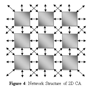 As the image has a two dimensional (2D) topology, therefore we use 2D model of CA. In a 2D CA model, the cells are arranged in a 2D grid with connections among the neighboring cells, as shown in the Figure 4. The central box represents the current cell (that is, the cell being considered) and all other boxes represent the eight nearest neighbors of that cell.
