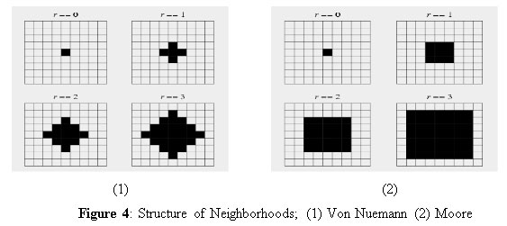 The Moore neighborhood also defines a radius but differs from the Von Neumann neighborhood in that, the Moore neighborhood also includes neighbor cell on the diagonals. A visual illustration of the Moore neighborhood can be seen in the Figure 4(2), for radii that vary from zero to three.