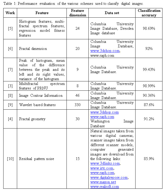 Table 1 shows the performance of various proposed methods to distinguish between natural images and CG images.