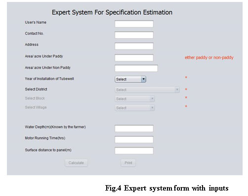 Initially, expert system for estimation window demanded some information to be filled by the farmer such as area under paddy, area under non-paddy and by selecting year of installation of tube well, district, block and village name as shown in fig.4. After selecting village some results were appeared on screen such as present depth, submersible depth for design and average rise/fall in groundwater. After clicking on calculate button, results are suggested for submersible pumping system such as total discharge required, hp required, available pump in market, wire diameter, wire length, generator rating, capacitor rating and voltmeter rating as shown in fig.5.