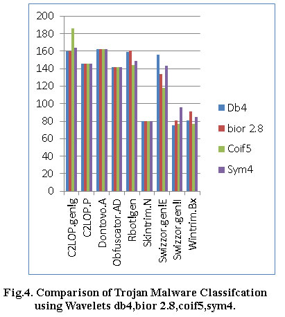 In this work we presented our result analysis in experimental shows that the proposed algorithm gives better classification results on Trojan Malware Class Recognition and malware class classification. This feature extraction method gives accurate malware class by using image processing techniques. The SVM classifier gives 92.52% accuracy. The classification error rate is very less compare to existing work on classification of malware. The contributions of this paper are as fallows. Wavelet Transform with DWT is used to extract effective wavelet based statistical features by applying wavelet transforms with wavelet family like db4, bior2.8, sym4 and coen5. Further our future work we develop model where we can classify and detect the particular Trojan malware family more accurately with genetic algorithm and adaboost techniques for classification of further research work.