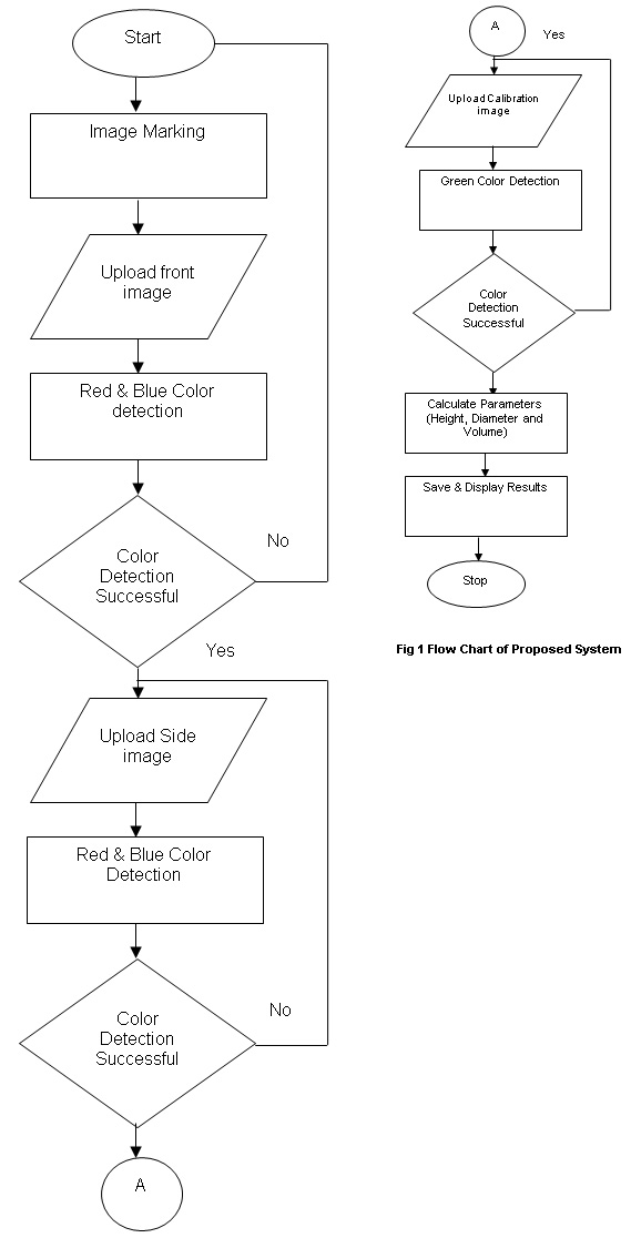 Image Marking: Initially the captured image is marked with the red, blue and green colors. Red color circles were fixed (one circle at the root of the tree and other is at the some distance high from the root) on the tree image to calculate the height. Blue color mark was used to calculate the diameter (DBH) and Green color mark was used to calculate the calibration factor. The calibration factor was used to eliminate the effect of distance in the tree images.