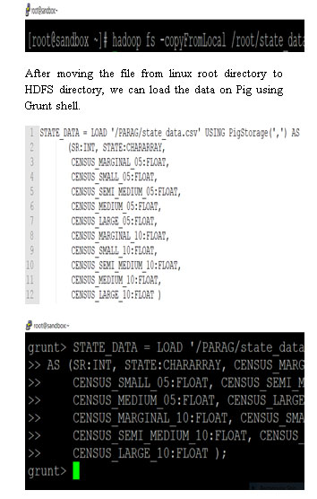 Once retrieve the comma separated values file from government website, we copied the file on linux platform. Once we copied on linux then we moved the same file on HDFS platform. Following is command to move the file from linux root directory to HDFS directory named PARAG. Copy From Local command is used to move the file from linux directory to HDFS directory.