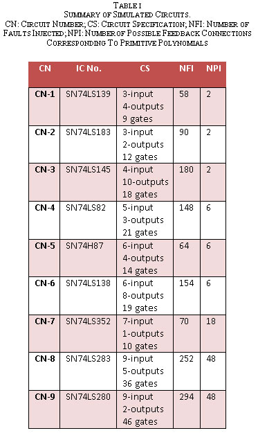Table 1: Summary of Simulated Circuits. CN: Circuit Number; CS: Circuit Specification; NFI: Number of Faults Injected; NPI: Number of Possible Feedback Connections Corresponding To Primitive Polynomials