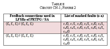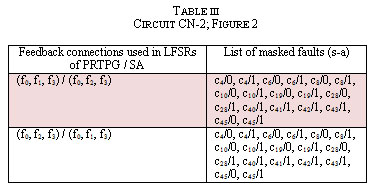 Further, it can also be observed from the results of the same table, that exactly the same faults are being masked when we use (f0, f2, f3) and (f0, f1, f3) as feedback connections in PRTSG and SA respectively. Also, another simulation result is presented here in Table III, which is obtained for CN-2 (see Figure 3).