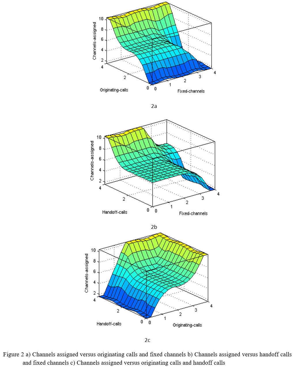 In addition to fixed channels there are guard channels assigned to every cell to cater the demands of handoff calls so that the ongoing calls are not terminated. The assignment of flexible channels is an additional advantage for giving space to the originating calls without disrupting the already ongoing calls. Based on the fuzzy rules are obtained in relationship various input membership functions. The IF-THEN rules are fed to fuzzy inference engine for decision making for assignment of flexible channels in low, medium or high groups in accordance with traffic density conditions. The relationship between membership functions is shown in Table 1. The three dimensional view between various membership functions is given in Figures 2a, 2b, and 2c and gives clear insight between originating calls, handoff calls and channel assignment.