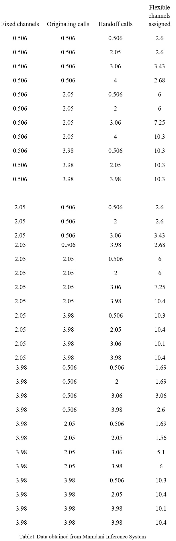 Flexible channel assignment strategies make use of centralized control and require central controller to monitor and have up-to-date information regarding the traffic pattern in its area in order to manage the assignment of the flexible channels. In addition, the scheduled flexible assignment is not adaptive to unexpected changes in traffic. The allocation of variable guard channels to combat handoff calls during high traffic conditions have been described in.5 The decentralized handoff scheme because of corner effect has been given in.6 In case the channels are exhausted and mobile station is moving fast, the handoff can be managed between macro cell and microcell till the target cell is available.7 However, the flexible channel allocation scheme sufficiently reduces the processing load of the system controller as compared to the dynamic channel allocation (DCS) scheme. The number of fixed and flexible channels acting dynamically is monitored and decided by fuzzy logic by acting to the variations of traffic density in the cell. In other wards virtual learning of the system is taking place from the processed data, which eventually resulted from the environmental and traffic changes.