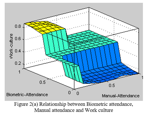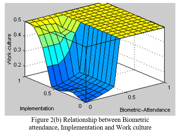 Fuzzy logic is flexible and is employed to handle the concept of partial truth, where the truth value may range between completely false, in contrast to Boolean logic, where the truth values of variables may only be the integer values of 0 or 1. The variables in mathematics usually take numerical values, the Fuzzy logic accepts linguistic variables such as, very cold, cold, warm, hot, very hot etc. Fuzzy logic control system is widely used in control engineering. Although alternate approaches such as neural networks and genetic algorithm are available for problem solving in many cases, the fuzzy logic approach has advantage of its simplicity of applying linguistic variables. The linguistic variables are used to formulate rules by incorporating IF and THEN conditions which finally decides the design of  controller. The bio-metric technology using fuzzy logic decision making has been reported in.8 Fuzzy controllers are simple having three main stages as input stage, processing stage and output stage. The input stage is of variables of interest the conditional combination of which is required to generate output. The processing stage invokes appropriate rule and generate a results for each then combines results of the rules. The processing stage is based on the collection of logic rules in the form of IF-THEN statements. The IF part is called the “Antecedent”and the THEN part is called the “Consequent” the typical fuzzy control system has dozens of rules. Figure 1 depicts the fuzzy logic block diagram for inclusion of bio metric attendance system for enhancing the work culture in Organization/Company/System. Three variables manual attendance, bio metric attendance and implementation are fed into the fuzzier. Based on the rule base these three variables are evaluated by Mamdani inference engine for effectiveness with respect to each other in response to various membership values. The results are fed to de fuzzifier which finally gives the relationship between input variables for yielding the effective end result.