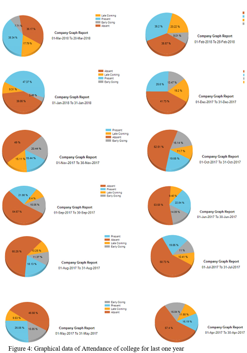 The graphical reports of bio metric attendance of one of the Colleges for last one year retrieved from Bio metric Attendance System are given in Figure 4. The graphical results give a clear insight about the variables of interest. The graphical results reveal that attendance percentage is high for the last three months, because the administration has monitored digital attendance for these months. Although some employees are on study leave and earned leave so the actual absent percentage will be lower by around 7 to 8%.  The absentees have considerably reduced although late coming and early going seems to be habitual with some employees and needs improvement which is possible only by forced implementation.