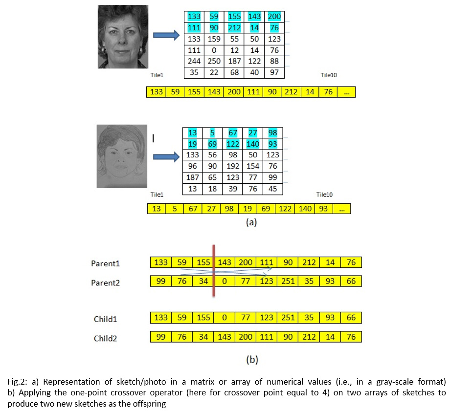 Figure 2a): Representation of sketch/photo in a matrix or array of numerical values (i.e., in a gray-scale format)b) Applying the one-point crossover operator (here for crossover point equal to 4) on two arrays of sketches to produce two new sketches as the offspring