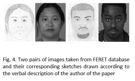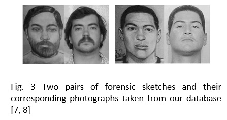 Due to accessibility restrictions to real-world forensic sketches, our second database was formed by 100 black-and-white images chosen from FERET database. For each image, according to verbal descriptions provided by the first author of this paper, their corresponding forensic sketches were drawn by a talented sketch artist. Fig. 4 shows two examples of true images and their corresponding drawn forensic sketches. So, in total, 188 photo/forensic sketch pairs were used for our experimentation.