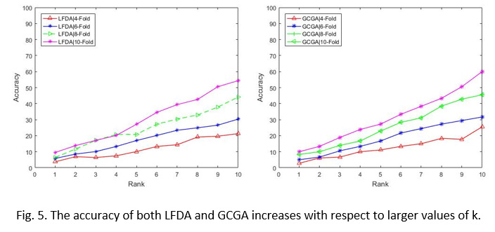 We used the k-fold cross validation technique for training and testing of our compared methods. Considering the size of our test data, we changed the value of k from 4 to 10. As Fig. 5 indicates, the accuracy of both LFDA and GCGA increases with respect to larger values of k.