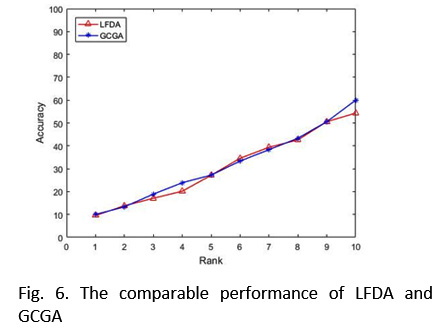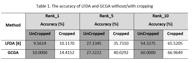 Finally, Table.1 summarizes the accuracy of LFDA and GCGA methods without/with cropping. According to the table, our GCGA method slightly outperforms LFDA even if cropping is not applied, especially for rank-10. This is mainly due to the incorporation of our proposed pre-processing phase. Furthermore, although the accuracy of both algorithms remarkably increases after cropping, it seems that GCGA performs fairly better than LFDA, particularly for rank-1 and rank-5.
