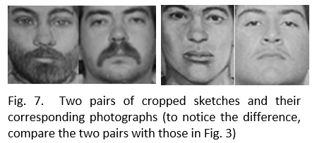 The first database was provided by.7,8 Each sketch was accompanied with a corresponding photograph of the subject who was later identified by the police. The sketches were drawn by forensic sketch artists working with witnesses who provided verbal descriptions after crimes were committed by unknown culprits. Fig. 3 depicts two pairs of forensic sketches and their corresponding photographs. As just mentioned, the corresponding photographs (mug shots) are the result of the subject later being identified. Given the quality of drawn sketches, we only chose 88 sketch/photo pairs.