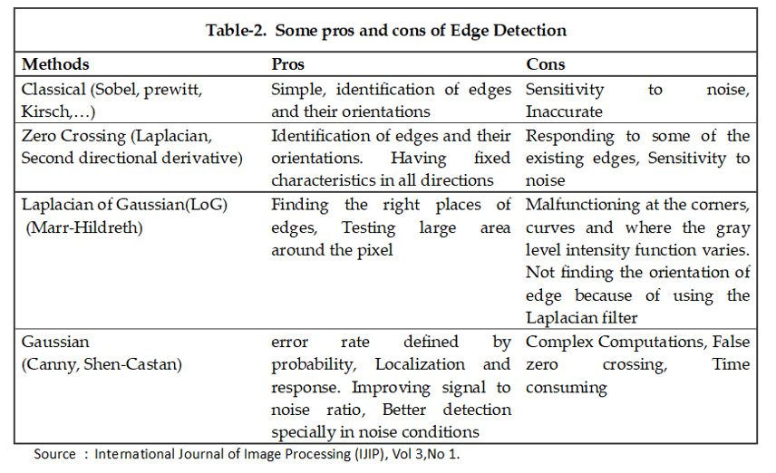 As edge recognition is an essential step in computer vision, it is important to bring up the true edges to get the optimised outcomes from the image processing.7 In this respect, Maini and Himanshu presented some pros and cons of Edge Detection Techniques (Table-2) within the conditions of object detection.