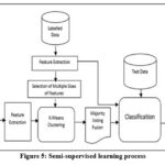 Figure 5 illustrates how semi-supervised learning techniques mix labeled and unlabeled instances to produce an appropriate function or classifier 19. In other words, semi-supervised machine learning is a sort of algorithm that falls in between supervised and unsupervised machine learning. In order to create the desired output, it therefore combines supervised and unsupervised learning methods and uses a combination of labeled and unlabeled datasets during the training phase. Although semi-supervised learning combines supervised and unsupervised learning and uses data with a few labels, the majority of the data it uses is unlabeled. As supervised and unsupervised learning are dependent on the presence or lack of labels, it cannot be compared to those two types of learning. To reduce the drawbacks of supervised learning and unsupervised learning methods, use semi-supervised learning. Instead of using solely labeled data as in supervised learning, the primary goal of semi-supervised learning is to make effective use of all available data 20. An unsupervised learning technique is used to cluster comparable data in the first place, and it also aids in labeling the unlabeled data into labeled data. The reason behind this is that labeled data is more expensive to acquire than unlabeled data.