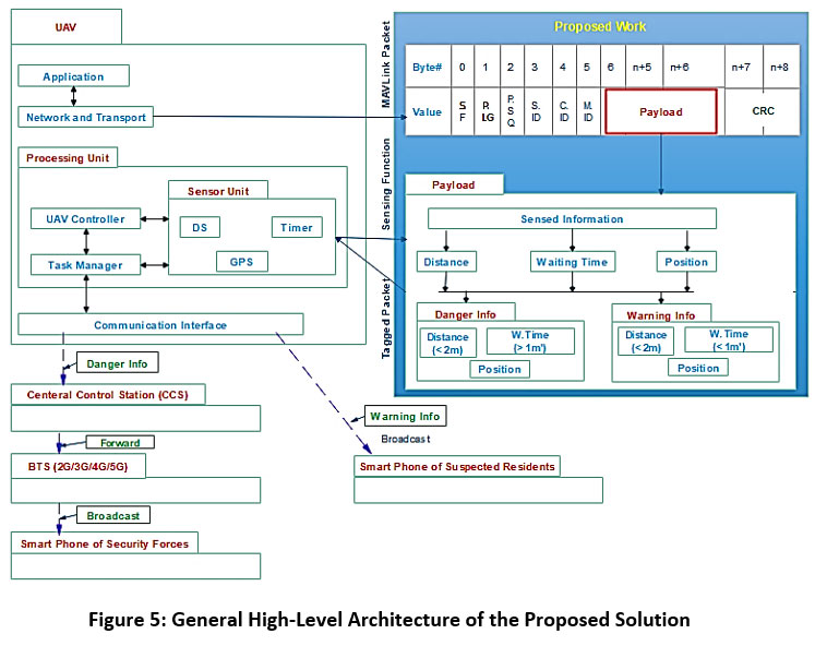 I describe and present the overall architecture of my proposed system on potential spots such as pedestrians’ walkways, restaurants, taxi fermatas, stadiums and open shopping centers as shown in Figure 1.4. As a first section, I describe and present my proposed distance sensor on UAV System operations which periodically sensing, tagging and disseminating the current distance, position and waiting time of resident’s information with MAVLink and other related packets. As a second section, approaches and objectives of forwarding models of the sensed information (tagged packets) to the respective infrastructures and residents including the security forces are discussed. And, as a final section, I discuss and present the general proposed architecture states.