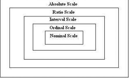 Measurement scales are hierarchal, and each level scale possesses all the properties of lower scales as shown below. Powerful analysis can be applied to data with more informative scale of measurement.