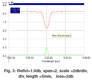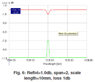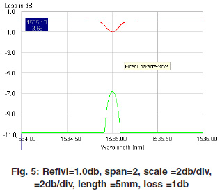 The below given graph are of uniform Fiber Bragg Grating.These plots are drown at grating length at 5 mm & 10 mm and different transmission loss 1 dB,2dB,3dB. These plots show the different reflectivity at different loss and Bragg wavelength.